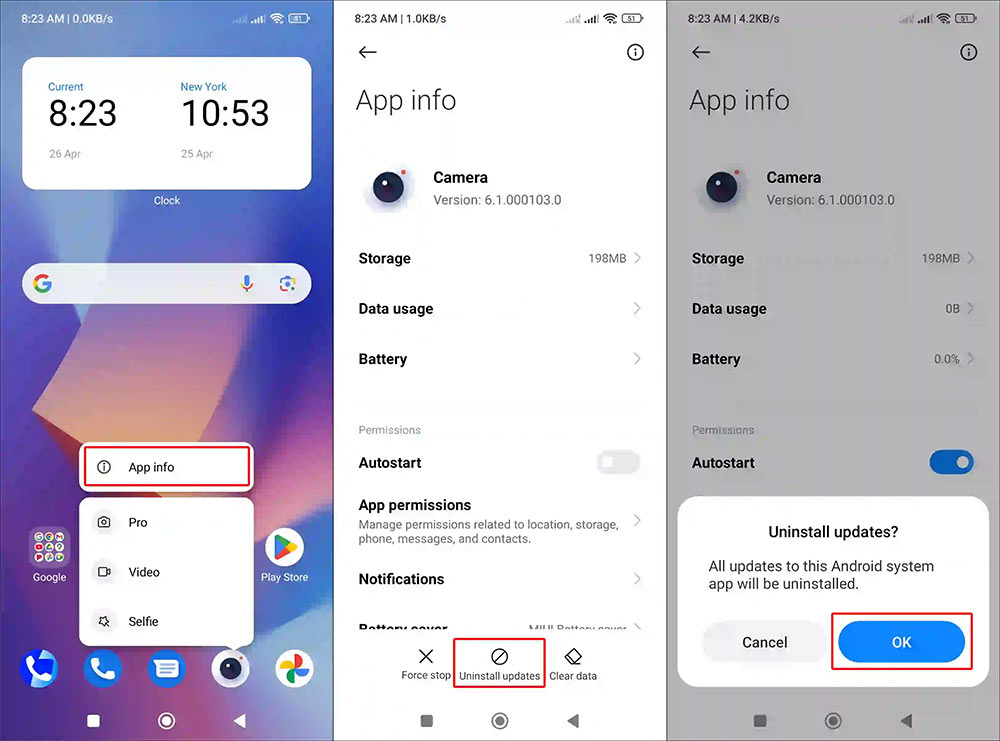 Nếu bạn nhận được thông báo phiên bản camera bạn đang sử dụng không tương thích với chế độ thiết bị thì cần gỡ bản cập nhật này. Nhấn và giữ vào biểu tượng camera, sau đó nhấn vào App Info và chọn Uninstall Updates.