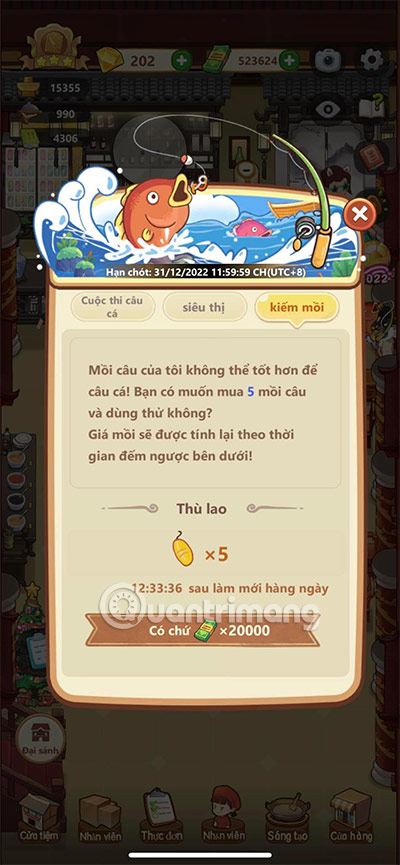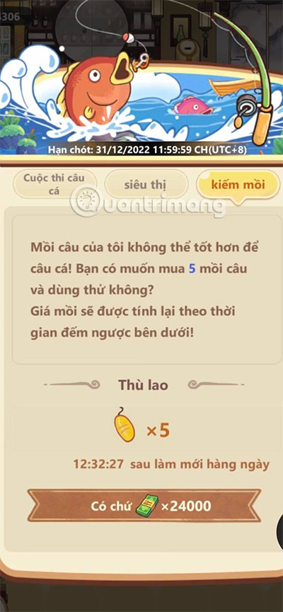 Dĩ nhiên bạn sẽ không thể dùng lưỡi và phao câu để mời gọi cá cắn câu. Bạn sẽ tốn 20.000 tiền cho lần đầu tiên mua mồi câu và những lần sau chúng sẽ tăng tiền mồi câu, thật là vô lý. Thời gian làm mới hiển thị bên cạnh giá mồi câu sẽ khiến giá mồi câu quay trở lại mốc 20.000 ban đầu.