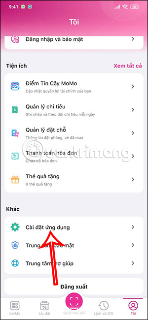 Tại giao diện trên ứng dụng MoMo, người dùng nhấn vào mục Tôi ở bên dưới để điều chỉnh. Chuyển sang giao diện tiếp theo, người dùng nhấn chọn vào mục Cài đặt ứng dụng.