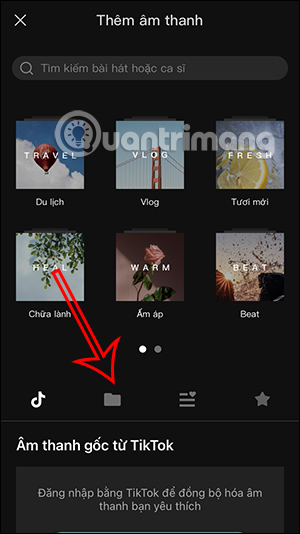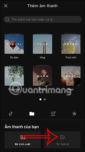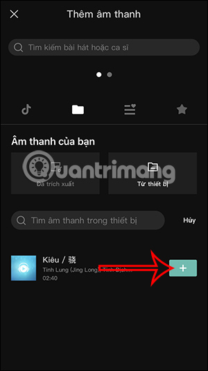 Tiếp đến chúng ta nhấn vào biểu tượng thư mục rồi chọn Từ thiết bị để chọn file âm thanh giọng chị Google đã tải xuống. Chọn xong âm thanh giọng chị Google thì nhấn vào biểu tượng dấu cộng để thêm âm thanh này vào video là xong.