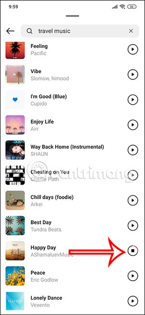 Nếu thích bài hát nào thì bạn có thể nhấn vào nút play để nghe trước bài hát. Thích bài hát nào thì nhấn vào bài hát đó để thêm cho Instagram Notes.