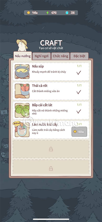 Để xây dựng "cơ sở vật chất" mới, hãy nhấn vào biểu tượng cái búa ở góc dưới bên phải. Trong menu xây dựng này, bạn sẽ thấy các cơ sở xây dựng khác nhau được phân loại theo Nấu ăn, Nghỉ ngơi, Chức năng và cơ sở Đặc Biệt.