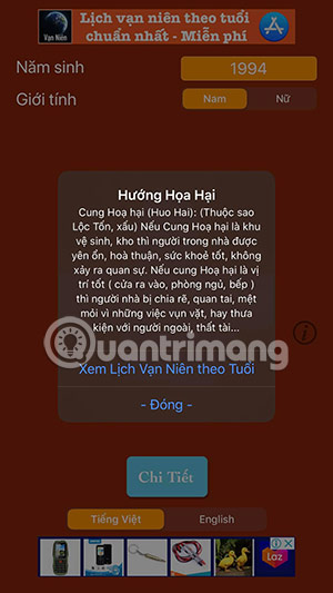 Bước 2: Nếu hiển thị màu xanh thì đó là hướng tốt, để biết rõ hơn bạn hãy bấm Chi Tiết. Trong bảng nhỏ này sẽ mô tả chi tiết hướng bạn ngồi như cung tốt hay cung xấu. Đồng thời bạn cũng biết được những khu vực nào nên tránh khi đặt bàn làm việc.