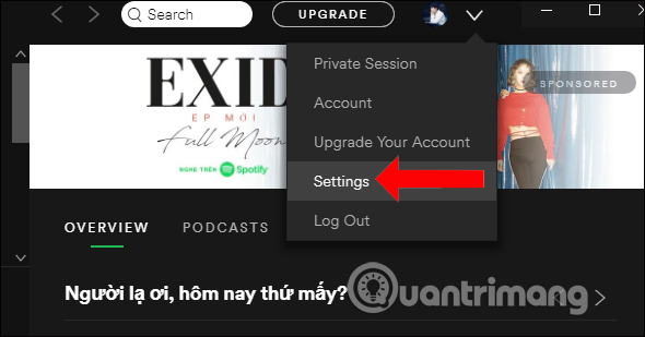 Tại phiên bản Spotify cài đặt trên máy tính, nhấn chọn vào biểu tượng mũi tên cạnh avatar tài khoản rồi chọn mục Settings.