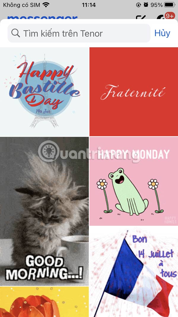 Hiển thị kho ảnh GIF trên Messenger để bạn tìm kiếm ảnh động theo ý thích của mình. Để tìm nhanh ảnh động thì bạn nhập chủ đề mà mình muốn tìm. Khi đã tìm được ảnh động muốn dùng thì nhấn chọn để đăng.