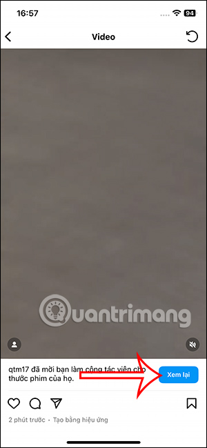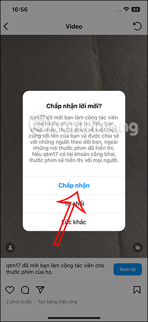Đối phương khi đó sẽ nhận được thông báo và họ nhấn vào Xem lại rồi chọn Chấp nhận để trở thành cộng tác viên video Reels của bạn.