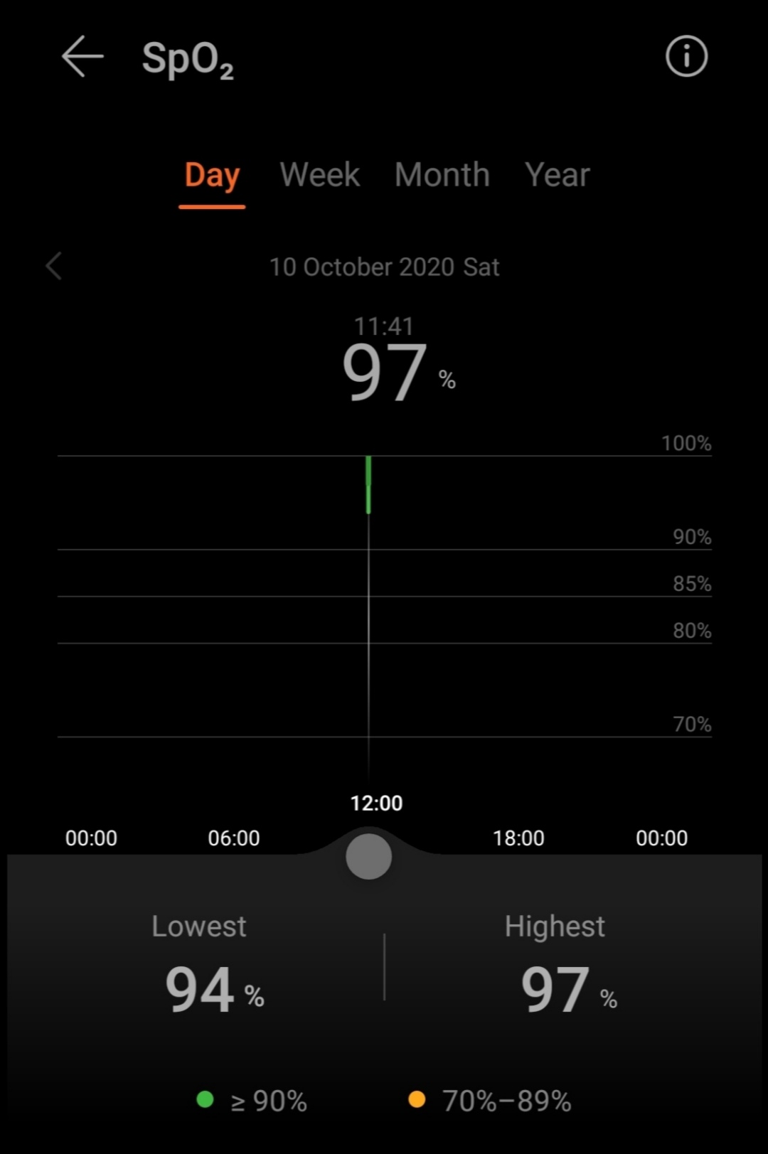 Bạn có thể kiểm tra SpO2 hoặc dữ liệu thống kê chỉ số SpO2 theo ngày/tuần/tháng/năm trên ứng dụng Huawei Health bất cứ khi nào bạn muốn, bởi đồng hồ tự dộng theo dõi chỉ số SpO2 của bạn.