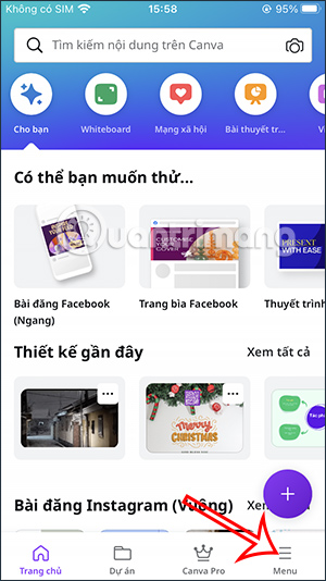 Tại giao diện trên ứng dụng Canva bạn nhấn vào biểu tượng 3 dấu gạch ngang bên dưới màn hình. Tiếp đến trong giao diện này bạn sẽ nhìn thấy các mục quản lý, chúng ta sẽ nhấn chọn vào mục Cài đặt.