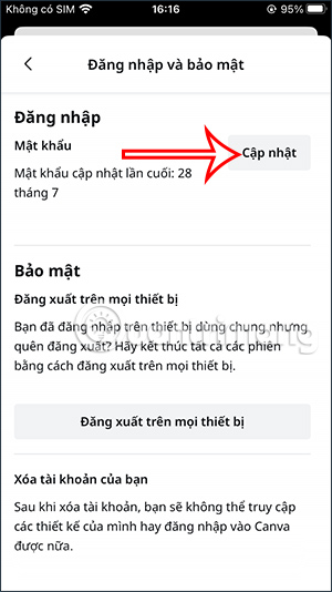 Nhìn sang giao diện bên cạnh tại phần Mật khẩu bạn nhấn vào nút Cập nhật để thay đổi lại mật khẩu cho tài khoản Canva.
