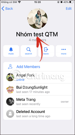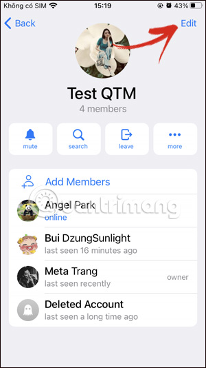 Tại giao diện ứng dụng Telegram, bạn nhấn vào nhóm Telegram mà mình muốn đổi tên. Sau đó nhấn vào tên nhóm Telegram mà bạn muốn đổi hiện tại. Tiếp đến trong giao diện thông tin nhóm bạn nhấn vào Edit để chỉnh sửa.