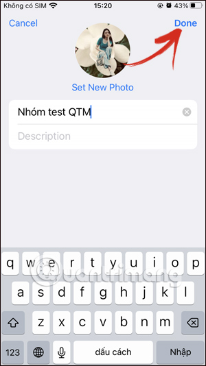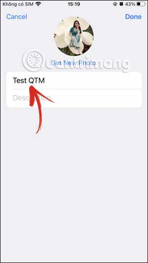 Hiển thị giao diện để thay đổi lại thêm nhóm Telegram. Bạn nhấn vào tên nhóm hiện tại để thay đổi sang tên khác mà bạn muốn sử dụng cho nhóm Telegram. Chúng ta nhập tên mới cho nhóm Telegram này rồi nhấn Done ở góc phải bên trên để lưu lại tên mới cho nhóm Telegram.