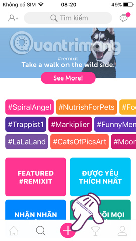 Sau khi cài đặt ứng dụng PicsArt thành công trên thiết bị và tải Typography "Vịt lộn, vịt dữa, cút lộn" xuống, chúng ta sẽ tiến hành ghép ảnh. Bạn mở ứng dụng PicsArt, giao diện đầu tiên chúng ta sẽ được hỏi có muốn nhận thông báo của PicsArt hay không. Tiếp đến trong giao diện chính, nhấn chọn biểu tượng dấu cộng phía dưới màn hình.