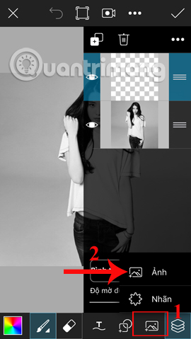 Người dùng sẽ thấy danh sách các công cụ chỉnh sửa hình ảnh. Nhấn chọn biểu tượng Thêm Layer ở góc ngoài cùng bên phải. Sau đó nhấn tiếp biểu tượng hình chữ nhật rồi chọn Ảnh.