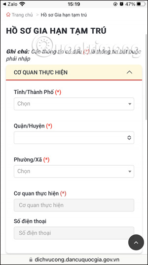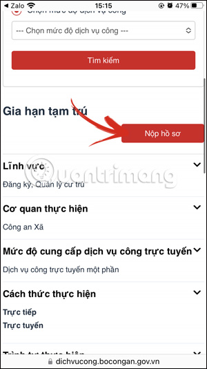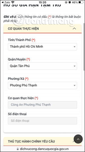 Kéo xuống bên dưới tại Thủ tục hành chính yêu cầu, bạn chọn thủ tục gia hạn tạm trú, và điền các thông tin được yêu cầu như trong giao diện.