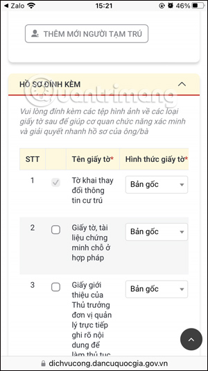 Tại thông tin người muốn gia hạn thủ tục tạm trú, điền các thông tin về nơi thường trú, tạm trú. Phần Hồ sơ đính kèm bạn theo dõi danh sách các hồ sơ cần nộp, bản gốc hay bản photo để chuẩn bị đầy đủ.