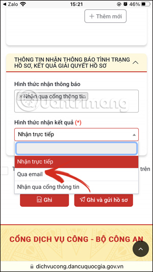 Bên dưới bạn lựa chọn cách thức nhận kết quả hồ sơ rồi nhấn Lưu và gửi hồ sơ.