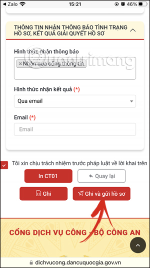 Tiếp đến mục nhận kết quả chọn trả qua email và sau đó in tờ đơn CT01 rồi nhấn vào nút Ghi và gửi hồ sơ để nộp hồ sơ tạm trú online.