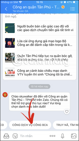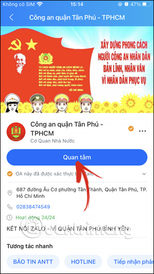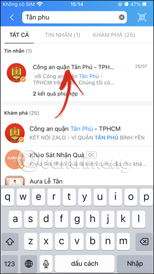 Tại giao diện trên ứng dụng Zalo, bạn nhấn vào thanh tìm kiếm rồi nhập từ khóa Công An quận Tân Phú rồi nhấn vào tài khoản Zalo OA này.
