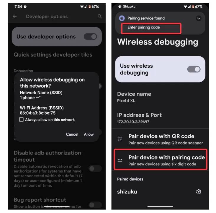 Bây giờ, hãy vào Developer Options trong Settings, bật Wireless Debugging và nhấn Pair device with pairing code.