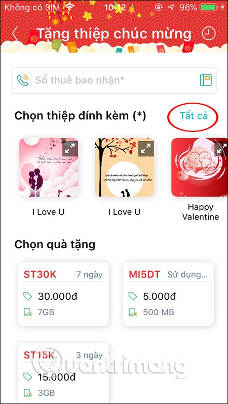 Chúng ta đăng nhập vào ứng dụng My Viettel rồi kéo xuống bên dưới, tới phần Tiện ích thì nhấn vào tính năng Tặng thiệp Lễ Tình Yêu. Chuyển sang giao diện mới bạn sẽ thấy có các mục nội dung cần điền. Trước hết tại Chọn thiệp đính kèm bạn nhấn vào Tất cả.