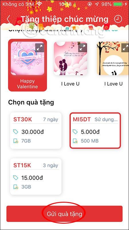 Hiển thị nhiều thiệp Valentine để chúng ta chọn. Nhấn vào biểu tượng mũi tên 2 chiều để phóng to thiệp, nhấn vào tên thiệp để chọn rồi nhấn Xong ở góc phải trên cùng. Quay lại giao diện bạn sẽ chọn quà tặng là 3 gói data ST30 với 7GB trong 1 tuần, MI5DT sử dụng 24h từ khi đăng ký với 500MB và ST15K 3GB/3 ngày. Nhập số điện thoại muốn gửi tặng ở bên trên và nhấn Gửi quà tặng bên dưới là được.