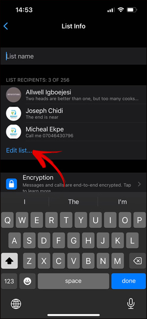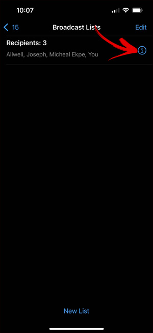 Để chỉnh sửa lại danh sách nhận tin WhatsApp này, bạn nhấn lại vào Broadcast Lists rồi nhấn vào biểu tượng chữ i cạnh danh sách bạn muốn thay đổi. Chuyển sang giao diện của danh sách nhận tin, chúng ta nhấn vào Edit list để chỉnh sửa lại danh sách này.