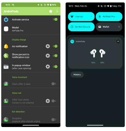 AndroPods cũng tương tự, nhưng đơn giản hơn một chút - bạn không thể tùy chỉnh thông báo nhiều và không có tùy chọn nào giúp bạn tìm AirPods. Tuy nhiên, phần trăm pin của hộp sạc trong biểu tượng thông báo là một điểm cộng.