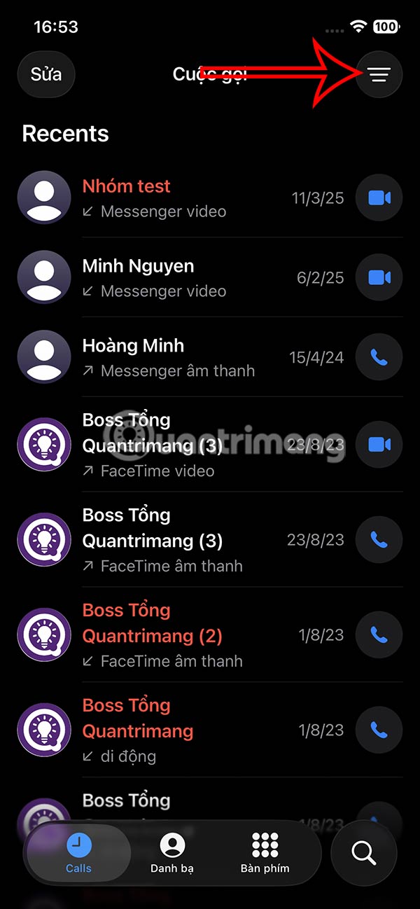 Đầu tiên bạn truy cập vào ứng dụng Điện thoại trên iOS 26 với giao diện mới được cập nhật. Sau đó bạn nhấn vào biểu tượng 3 dấu gạch ngang ở góc phải trên cùng giao diện.