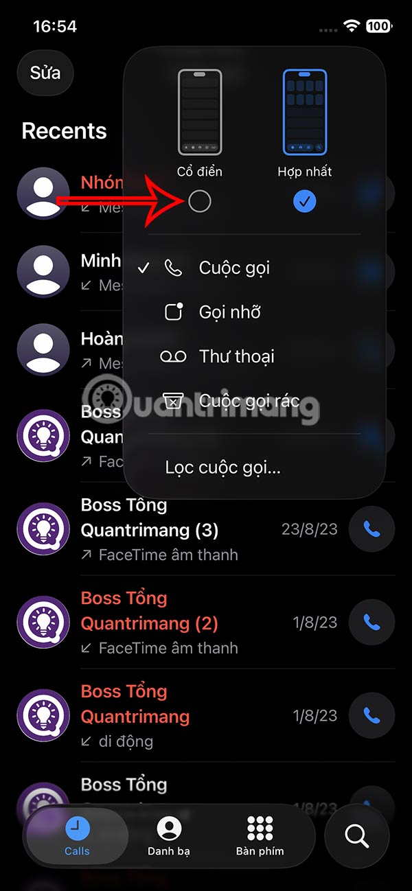 Lúc này hiển thị menu tùy chọn cho giao diện ứng dụng Điện thoại, bạn nhấn vào Cổ điển để quay về giao diện cũ trước đó.