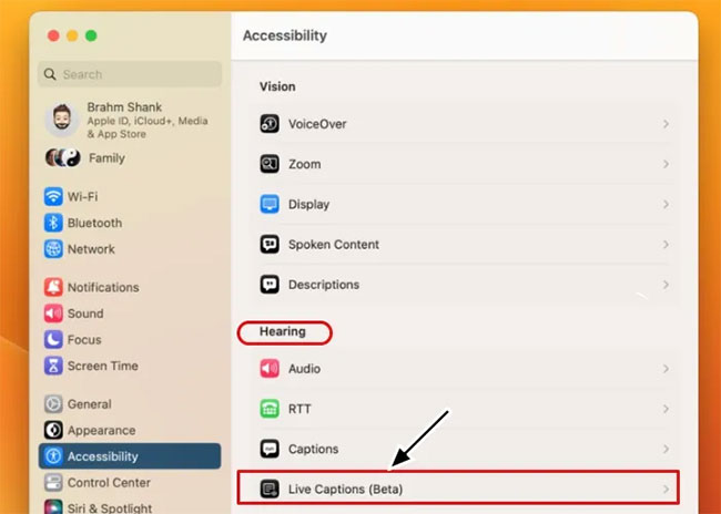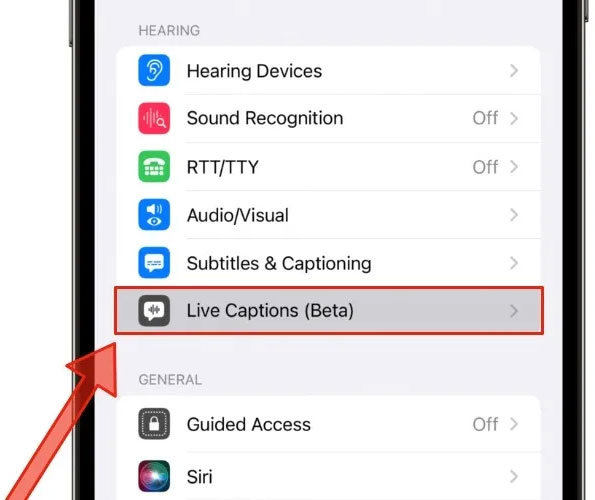 3. Nhấp vào Live Captions (Beta) trong Hearing.