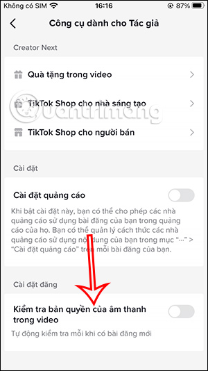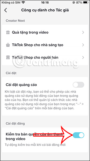 Chuyển sang giao diện các mục thiết lập cho tài khoản TikTok của bạn. Tại đây bạn kéo xuống bên dưới tới mục Cài đặt đăng sẽ thấy tùy chọn Kiểm tra bản quyền âm thanh trong video. Chúng ta sẽ kích hoạt chế độ này để TikTok kiểm tra video.