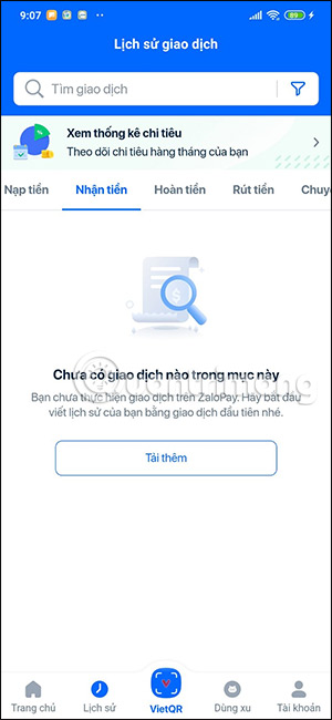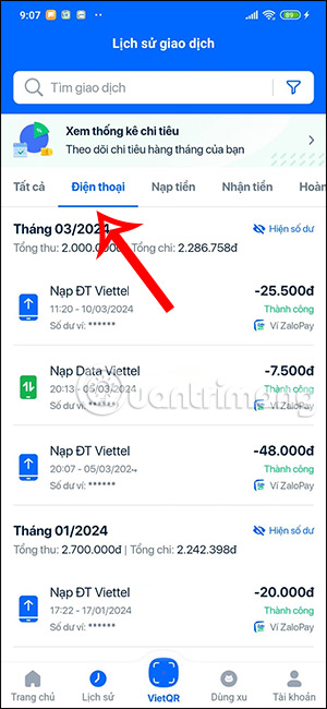 Nếu bạn chỉ muốn xem một loại giao dịch nào trên ZaloPay thì chúng ta nhấn vào mục giao dịch đó ở bên trên.