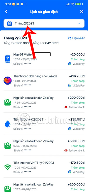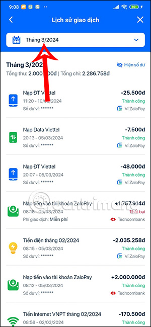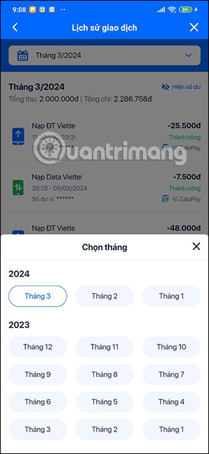 Bên cạnh đó bạn có thể nhấn vào biểu tượng bộ lọc ở thanh tìm kiếm để tìm lịch sử giao dịch trên ZaloPay theo tháng. Nhấn tiếp vào biểu tượng mũi tên xổ xuống để hiển thị tùy chọn ngày tháng muốn kiểm tra lịch sử giao dịch trên ZaloPay.