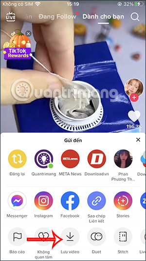Trước hết chúng ta sẽ tiến hành tải video TikTok xuống điện thoại. Bạn tải video TikTok như bình thường, nhấn vào biểu tượng chia sẻ rồi nhấn vào biểu tượng download.