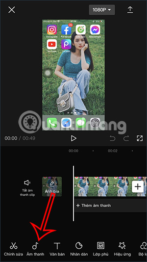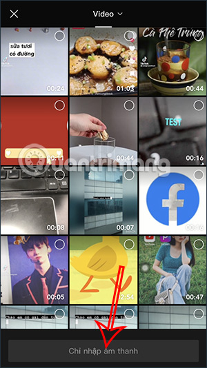Trong giao diện chỉnh sửa video trên CapCut, chúng ta nhấn vào tab Âm thanh. Lúc này hiển thị giao diện album trên điện thoại, bạn nhấn vào video TikTok có âm thanh mà chúng ta muốn sử dụng, rồi nhấn Chỉ nhập âm thanh ở bên dưới để chỉ lấy bài hát cho video này mà thôi.