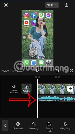 Ngay lập tức ứng dụng CapCut sẽ trích xuất âm thanh từ video mà bạn rồi chèn vào video mà chúng ta đã tiến hành chỉnh sửa trên ứng dụng. Bây giờ bạn có thể thay đổi lại âm thanh này nếu muốn, chẳng hạn giảm âm lượng của âm thanh.