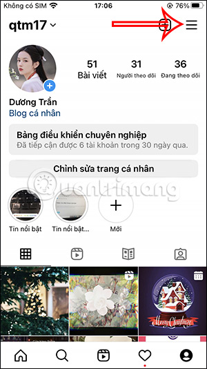 Tại giao diện trên Instagram bạn nhấn vào ảnh hồ sơ bên dưới rồi nhấn vào tiếp vào biểu tượng 3 dấu gạch ngang, trong giao diện tài khoản Instagram cá nhân của bạn.
