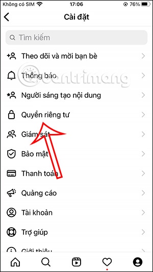 Bên dưới màn hình hiển thị tùy chọn, chúng ta nhấn chọn vào mục Cài đặt. Tiếp đến ở giao diện Cài đặt này, người dùng nhấn chọn vào mục Quyền riêng tư để điều chỉnh.