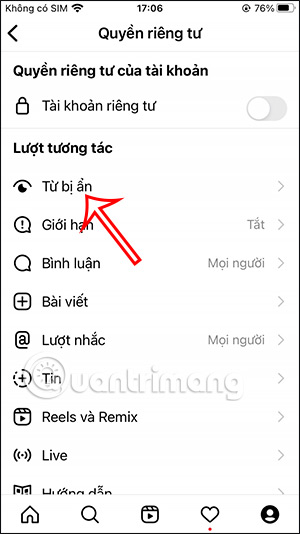 Tiếp tục bạn sẽ nhấn chọn vào mục Từ bị ẩn để điều chỉnh nội dung bị ẩn trên tài khoản Instagram của bạn. Lúc này bạn sẽ nhìn thấy mục Ẩn tin nhắn đang chờ để kiểm soát lại những tin nhắn đang chờ trên Instagram.