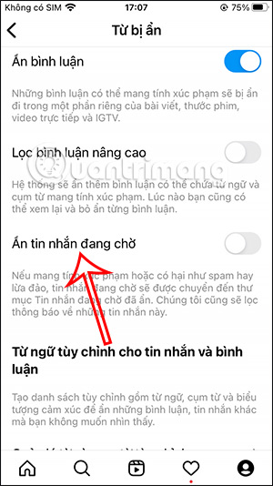 Chúng ta sẽ cần kích hoạt chế độ ẩn tin nhắn đang chờ trên Instagram. Khi đó, những tin nhắn chờ có nội dung xúc phạm, spam thì sẽ được chuyển tới mục Tin nhắn đang chờ đã ẩn và lọc thông báo về những tin nhắn này.