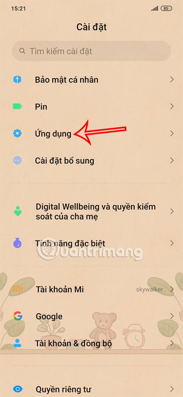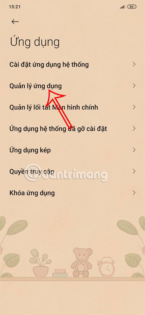Tại giao diện trên điện thoại Android bạn nhấn vào Cài đặt rồi nhấn tiếp vào Quản lý ứng dụng để truy cập ứng dụng cài đặt trên điện thoại.
