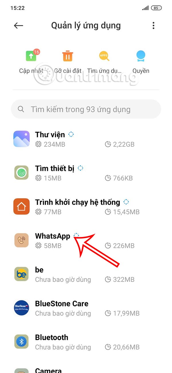 Chuyển vào giao diện tiếp theo, chúng ta nhấn vào mục quản lý Các dịch vụ đang chạy. Khi đó bạn sẽ thấy danh sách các ứng dụng chạy nền trên Android, trong đó có ứng dụng WhatsApp, nhấn vào WhatsApp để thay đổi.