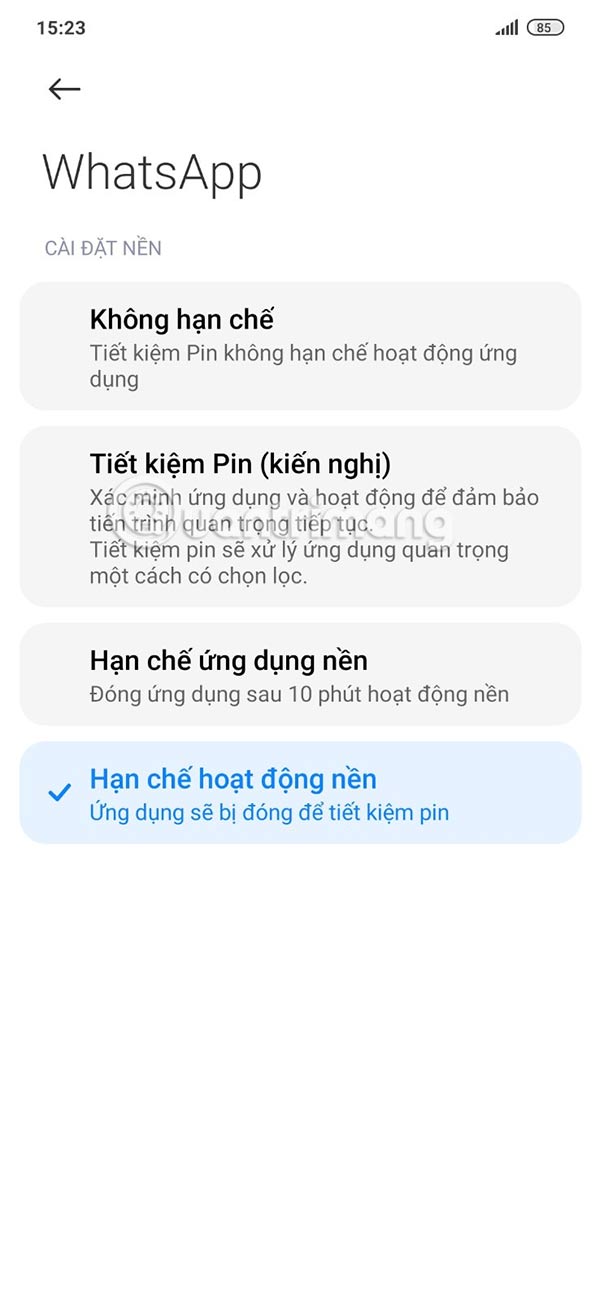 Trong trường hợp bạn vẫn muốn sử dụng ứng dụng thì nhấn chọn Hạn chế ứng dụng nền để đóng WhatsApp hoàn toàn sau 10 phút hoạt động nền.