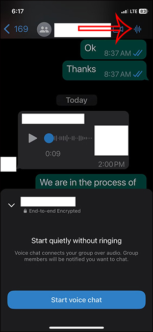 Tại giao diện nhóm WhatsApp, chúng ta nhấn vào biểu tượng âm thanh ở góc phải trên cùng như hình dưới đây. Tiếp đến hiển thị thông báo cho tính năng voice chat trong nhóm, bạn nhấn vào Start voice chat để bắt đầu.
