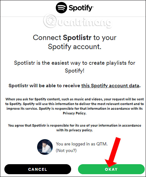 Trong trường hợp bạn không mở Spotify thì cần đăng nhập tài khoản. Nếu đang mở Spotify thì cần đồng ý để Spotlistr liên kết với tài khoản Spotify, nhấn OK để đồng ý.