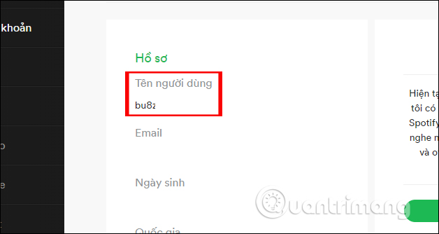 Nhìn sang bên phải sẽ thấy Tên người dùng là chuỗi ký tự mà Spotify cung cấp cho từng tài khoản Spotify. Hãy sao chép dãy ký tự này lại nhé.