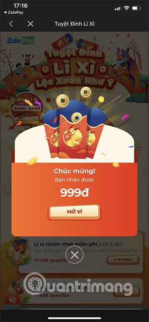 Ngay sau đó bạn sẽ nhìn thấy phần thưởng mà mình nhận được hiển thị trên màn hình. Nếu nhận được tiền thì số tiền đó sẽ được chuyển vào tài khoản ZaloPay của bạn luôn.