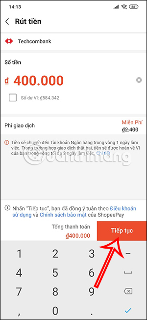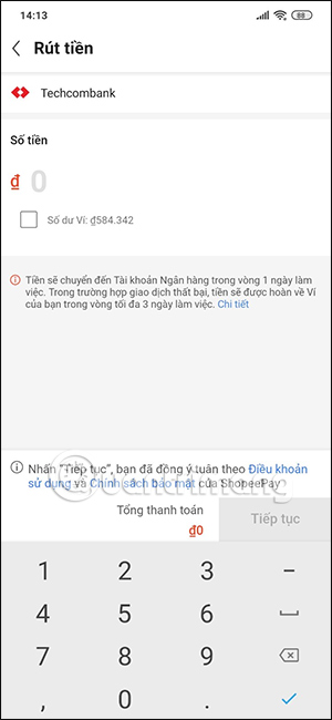 Hiển thị giao diện để bạn nhập số tiền rút từ ShopeePay về tài khoản ngân hàng đã liên kết. Chúng ta nhập số tiền muốn rút vào giao diện và sẽ thấy phí giao dịch thực hiện là bao nhiêu. Chú ý tới số tiền hiện tại còn trong ví là bao nhiêu ở ngay bên dưới. Sau đó nhấn Tiếp tục để thực hiện.