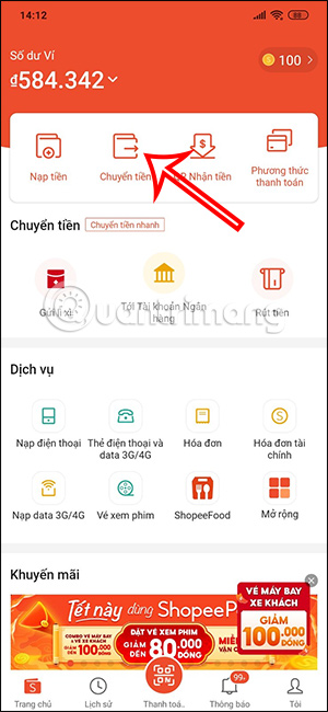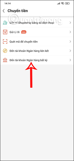 Tại giao diện ứng dụng ShopeePay bạn nhấn vào mục Chuyển tiền. Lúc này hiển thị các tùy chọn rút tiền từ ShopeePay, bạn chọn vào Đến tài khoản Ngân hàng bất kỳ.