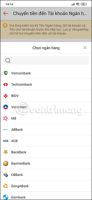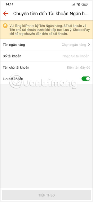 Khi đó hiển thị giao diện để bạn điền thông tin ngân hàng muốn chuyển tiền ShopeePay về. Chúng ta chọn tài khoản ngân hàng mà ShopeePay hỗ trợ, sau đó điền đầy đủ thông tin ngân hàng hiển thị.